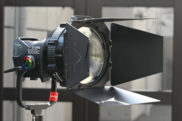 You can also buy the Aputure STORM 1000c Cine Kit with Skid Support, Fresnel, and Barndoors for $5,037 USD.