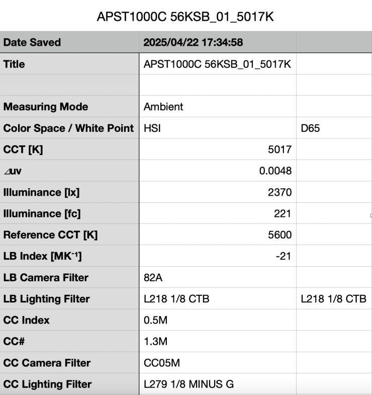 SSI (Spectral Similarity Index) was developed by the Sci-Tech Council of the Academy. SSI gives me the ability to set any light as a standard, or use predefined standards (such as CIE D55), and then give other lights an SSI score based on how well they will match standards such as CIE D55. This way I can measure spectral response and compare it directly against an ideal light source. This is actually a much better test than recording CRI scores, but it won’t tell you everything you need to know.