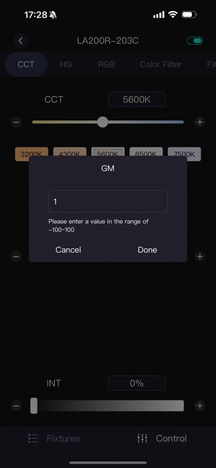Once you tap on the fixture you will be taken to the home screen of the app, where the light will be in the default CCT operating mode.