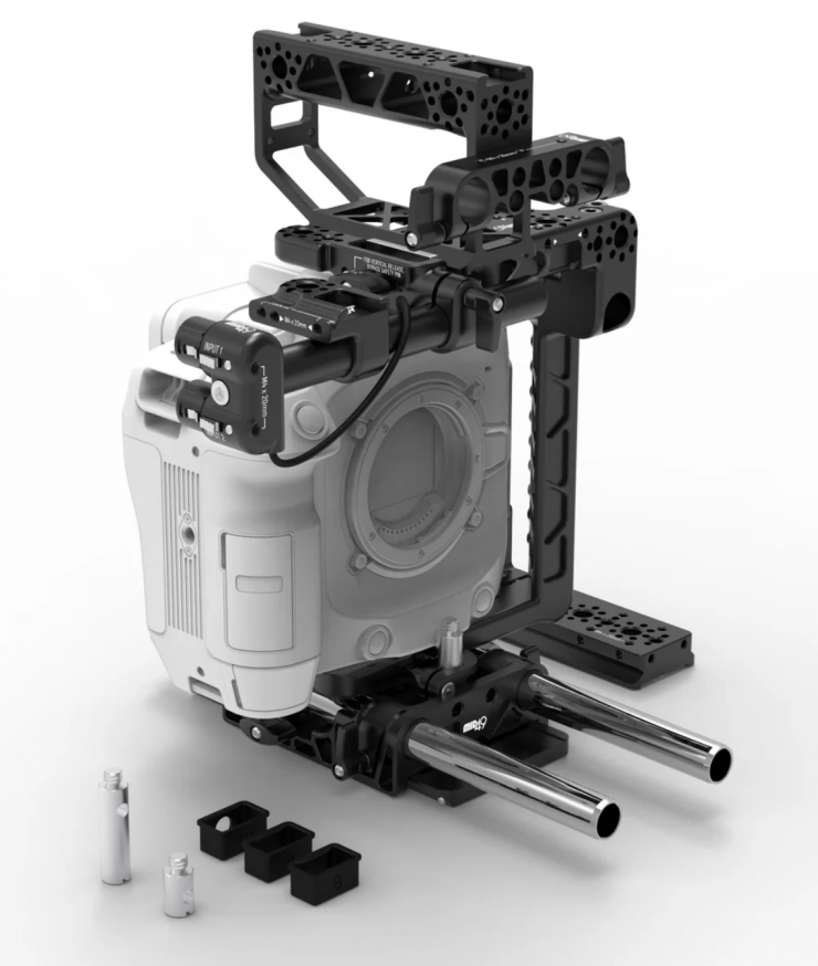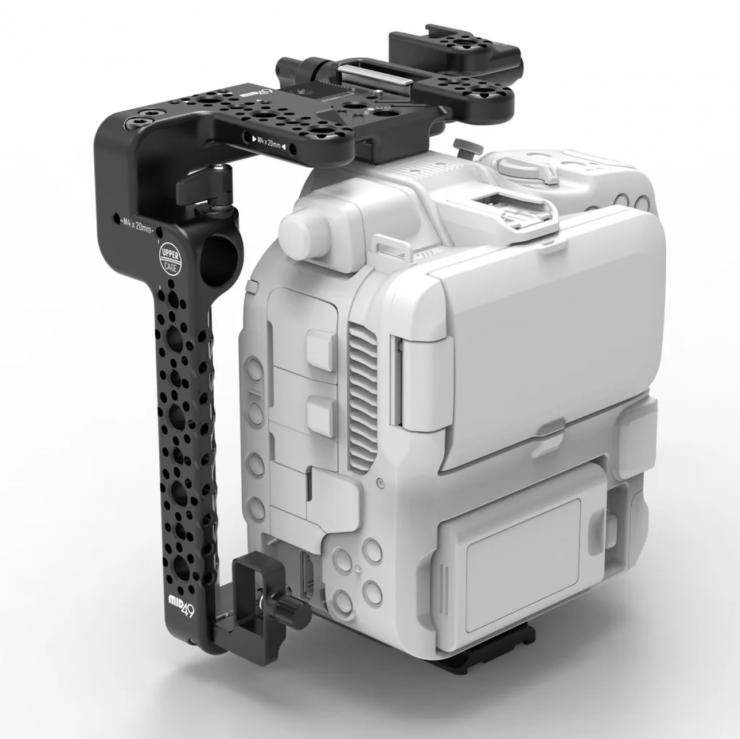 MID49 has a range of accessories and kits for the Canon C80. The Canon C80, a smaller compact camera body similar to a fat mirrorless rather than a boxy cinema camera, works much better with a cage to mount accessories like a monitor, audio receivers, and wireless video TXs. Without a cage, you are very limited to what you can add.